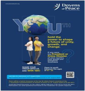 ![]() A Pan Southasia Network of Civil Society Organisations, Youth and Trade Unions, Professional Bodies and Institutions interested in promoting Vision for Southasia and collaborating and participating in programs and activities of common concern of the region. This Platform provides a unique opportunity to collaborate / participate Online and Offline in Events and Programs by Member Organisations and Youth Groups in the Southasian Countries. The Platform privileges youth from different countries of Southasia to facilitate their vision and expression for the Region to start thinking about issues from cross border perspectives and explore their solutions collectively. Countries Covered: Afghanistan, Bangladesh, Bhutan, India, Maldives, Nepal, Pakistan and Sri LankaTwo Events were organised during 2025-26 on 12th August – International Youth Day and 8th December – SAARC Charter Day.Videos of 2 to 5 minutes were invited from youth between 15 and 25 on the Themes of My Vision for Southasia if I am the President or Prime Minister of my Country and How can Youth collaborate across borders to reduce poverty and promote peace in Southasia. 198 and 223 videos respectively were received that collectively crafted inspiring Visions and a 9-Point Strategic Youth Blueprint to transform regional cooperation and tackle fragmentation through youth-led initiativesJune to December 2025: A Report Doyens of Peac Pan-Southasia Youth Platform Distilled Highlights and Proposed ActionsDoyens of Peace is a pan-South Asia Platform bringing together youth, civil society organisations and educational institutions from Afghanistan, Bangladesh, Bhutan, India, Maldives, Nepal, Pakistan, and Sri Lanka. The platform enables youth-led dialogue, cross-border collaboration, and practical action for peace, regional cooperation, and sustainable development. Inaugural Event — 12 August 2025 (International Youth Day)