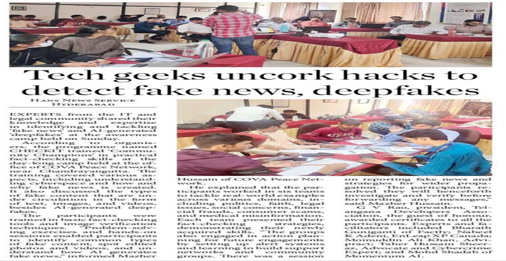 Fake news: COVA trains community volunteers in fact-checking skillsProblem-solving exercises, and hands-on sessions enabled participants to identify fake content, spot edited photos/videos, and understand how AI generates fake news Confederation of Voluntary Organizations Peace Network conducting training for community volunteers in practical fact-checking skills. Hyderabad: To spread awareness on fake news, the Confederation of Voluntary Organizations (COVA) Peace Network on Sunday conducted CHECKIT, a programme to train community volunteers in practical fact-checking skills. CHECKIT TechCampPractical Fact Checking skills for Community Volunteers Problem solving exercises and Hands On Sessions enabled participants to identify common types of fake content, spot edited photos / videos and understand how AI generates fake news / deep fakes. Participants worked in six teams to tackle real-world examples across various domains including politics, faith, legal issues, social concerns, financial frauds, consumer scams, and medical misinformation. Each team presented their fact-checking strategies, demonstrating their newly acquired skills. The groups also engaged in Action Planning for future engagements by setting up alert systems and learning to build support networks and community groups. Finally, there was a session on reporting fake news to relevant authorities and strategies for wider propagation. Giving feedback at the end of Program, participants shared they are inspired by the program and learned about fake news and it’s decoding in detail. They accepted that it is their duty now to spread their learning with their families and society to prevent them from becoming victims of disinformation, fake news, financial frauds and polarisation of society that could lead to violence and riots. All agreed that we are biased by our religions and ideologies and tend to accept even fake news as correct and become guilty of spreading it. They resolved they will henceforth investigate and verify before forwarding any messages. Further, they will use fact-checking tools in personal and professional projects and form or join local fact-checking groups to decode every viral news and create awareness campaigns through workshops and training sessions on how to fact check news on social media and identify the fake news, frauds and deep fakes using Google and other fact check tools. Some offered to develop resources and write articles or blog posts about fake news and its impact. All were unanimous that they will encourage friends and family to verify information before sharing and to be careful while using social media One Day Training on Artificial IntelligenceOrganized by: COVA Peace Network Program Report