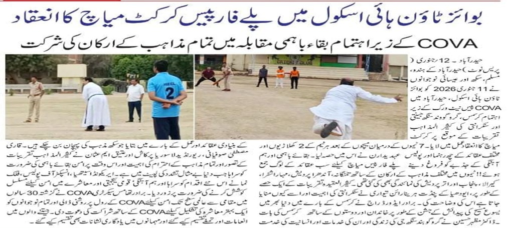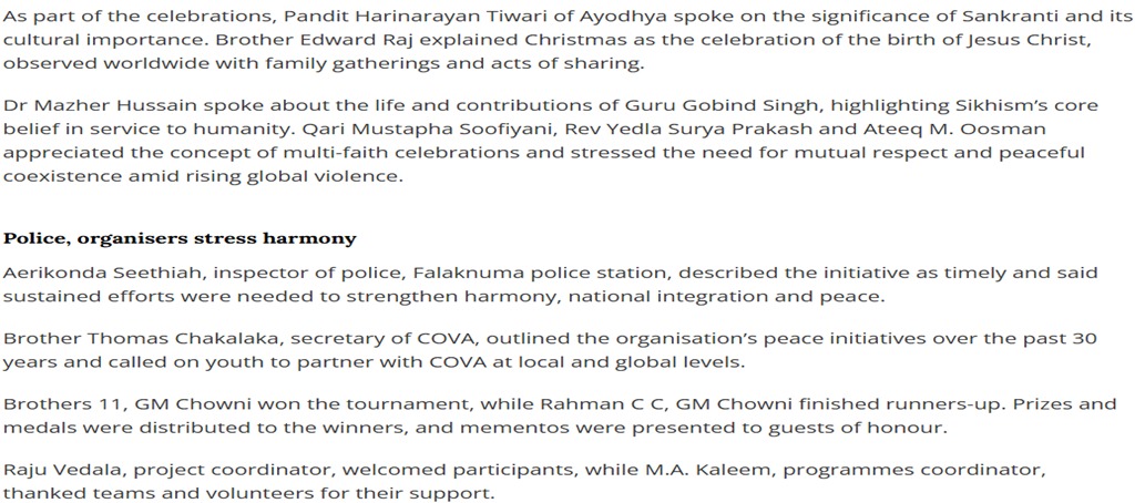 Each competition provided a platform for students to express their understanding of the theme in unique and impactful ways. A distinguished panel of judges from diverse fields ensured fair evaluation and high standards: The One Act Plays, in particular, stood out for their powerful storytelling and impactful messages against fake news and hate propagation. Valedictory Function The event served as a meaningful platform for young minds to engage with important societal issues and contribute towards building more informed and responsible communities. Sports4Peace Cricket Tournament Unites Hyderabad, January 11, 2026: In a stirring display of unity, harmony and shared humanity, Hindu, Muslim, Christian and Sikh youth of Hyderabad came together for the Sports4Peace Cricket Tournament and Multi-Faith Celebrations, organised by COVA Peace Network on January 11, 2026, at Boys Town High School, Hyderabad. Cricket as a Bridge for Peace and Brotherhood After the league matches, a special highlight of the day was the “Play for Peace Match”, in which two members from each team, along with leaders of different faiths and police officers, joined hands on the cricket field. This symbolic match celebrated the spirit of partnership, coexistence and harmony at a time when the world is grappling with unprecedented violence and conflict. Multi-Faith Voices Highlight Shared Human Values Police Applaud Novel Initiative for National Integration COVA’s Three-Decade Commitment to Peace highlighted COVA Peace Network’s 30 years of work for peace, from grassroots initiatives to global engagement. He invited young people from all backgrounds to partner with COVA in building a more just, peaceful and compassionate world. Hyderabad Youth hold Multi-faith Cricket event for Harmony A Strong Message from Hyderabad Please Visit: www.jointcelebrations.covanetwork.org |