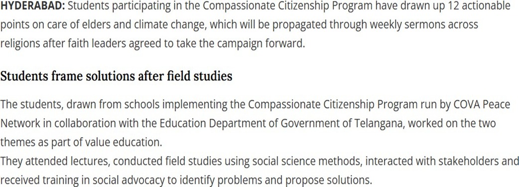 Compassionate Citizenship ProgramCompassionate Citizenship Program, evolved by COVA, is now made part of value Education Program by Education Department of Government of Telangana for students of government, private and residential schools with an MoU to implement in 3000 schools of the State. The objective is to take students beyond textbooks and classrooms to also make them compassionate human beings who are sensitive to different social issues through extension lectures, direct field engagements and Project Works with affected sections of society. Students are also oriented to social advocacy and encouraged to undertake micro level social transformations and community improvement. As part of Value Education, students from participating schools underwent an intensive learning process that included expert lectures, social science–based field studies, stakeholder interactions, and training in social advocacy. Through this structured engagement, students examined real-world challenges, identified