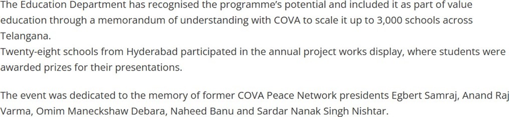 | COVA works in close collaboration with a large number of organisations in Hyderabad, Telangana, India, Southasia and globally on a range of issues from Intra Faith Initiatives, Multi Faith Celebrations, communal harmony, violence prevention, peace, empowerment of youth and communities, good governance, disaster relief etc. | |||||||||||||||||||||||||||||||||||||||||||||||||||||||||||||||||||||||||||||||||||||||||||||||||||||||||||||||||||||||||||||||||||||||||||||||||||||||||||||||||||||||||||||||||||||||||||||||||||||||||||||||||||||||||||||||||||||||||||||||||||||||||||||||||||||||||||||||||||||||||||||||||||||||||||||||||||||||||||||||||||||||||||||||||||||||||||||||||||||||||||||||||||||||||||||