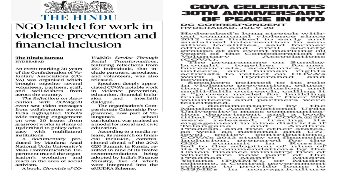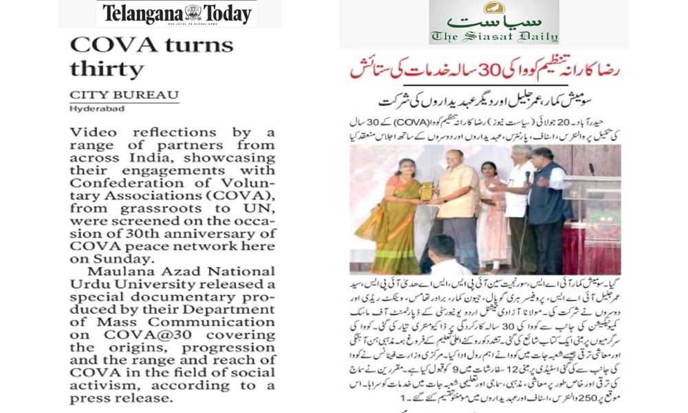 | COVA celebrated 30 years of Service through Social Transformations on 20th July 2025 with release of The Chronicle of COVA@30 along with a Video and eBook Reflections of Partners and a Documentary by Maulana Azad National Urdu University (MANUU).The Reflections and the documentaries detailed the engagements of COVA from Slums of Hyderabad to Districts, States, National, Southasia, Multi Laterals to the UN.