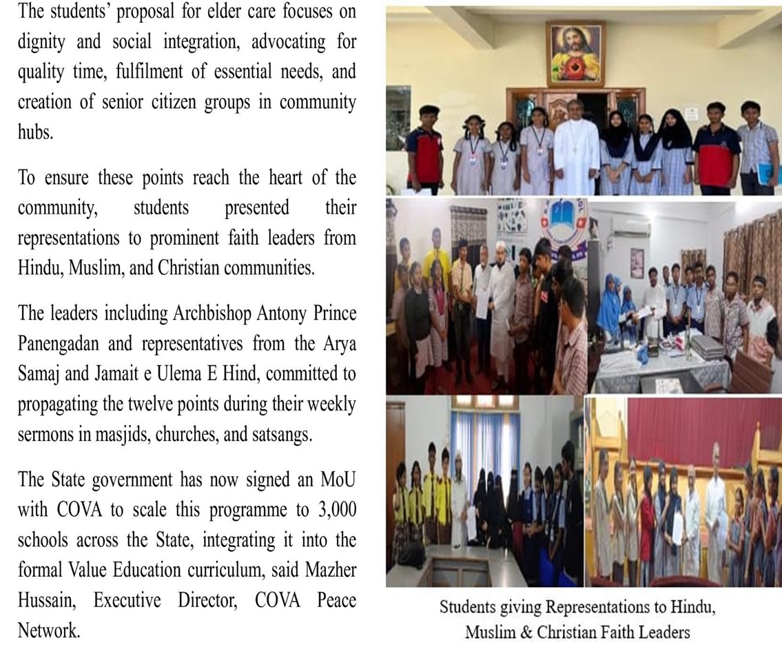 12 Actionable Points Proposed by Students Care of Elders – 5 Key Actions Climate Crisis – 7 Key Actions Faith Leaders Join Hands for Awareness Campaign Plastic-Free School: Students Turn Advocacy into Action Recognising the transformative potential of the Compassionate Citizenship Program, the Education Tribute to COVA Peace Network Leaders Students’ 12-point action plan on elders, climate change to feature in sermons across faiths Resource Persons: Arunya Jyothi and Ruchit Asha Kamal Guests of Honour who presented prizes to students, mementos to schools and Resource Persons and addressed the gathering were Mr. Asadullah Pervez formerly of Emirates Airlines, Mr. Peter H Jayakar, Mr. Abdus Salam, Compassionate Citizenship Program 2025–26